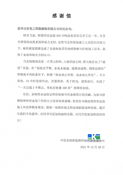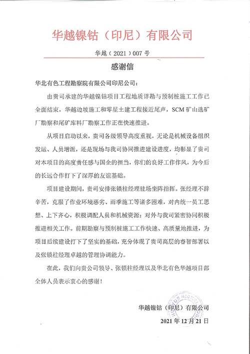 歲末年初,華越鎳鈷(印尼)有限公司、印尼金瑞新能源科技有限責任公司等陸續(xù)給華北有色工程勘察院有限公司印尼公司發(fā)來感謝信,信中對公司以高度的政治自覺和強烈的使命擔當,高質量、高效能提供的技術服務以及展現出的華勘人的責任和擔當予以肯定和表揚。