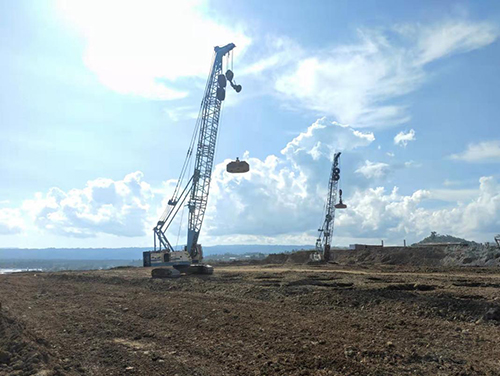 面對工程難度大、工期緊的局面,項目部本著對業(yè)主負責的原則,科學組織、周密部署,以高質量建設,嚴標準管理,樹立責任意識、質量意識和精品意識,以極大的熱情和扎實有效的工作投入到項目建設中來。為了應對區(qū)域回填土質差無法施工的問題,項目部與甲方協商后采用在填土層上鋪設碎石料的方法,有效解決了泥濘場區(qū)強夯施工難題。為了追趕工期,項目部在原有3臺夯機施工的基礎上,攻堅克難,積極籌備,再次增添2臺強夯設備,并組織人員加班加點全力施工,大大提高了施工進度。