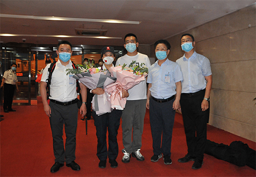 儀式結束后,在鮮花和掌聲中,隊員們入貴賓候機室,黨委書記劉喜鵬代表黨委及全隊職工獻上鮮花,并歡迎何亞靜同志回家。在經(jīng)歷了四十多天的分離后,何亞靜同志終于迎來了與家人團聚的時刻,并與前來接機的家屬緊緊相擁。