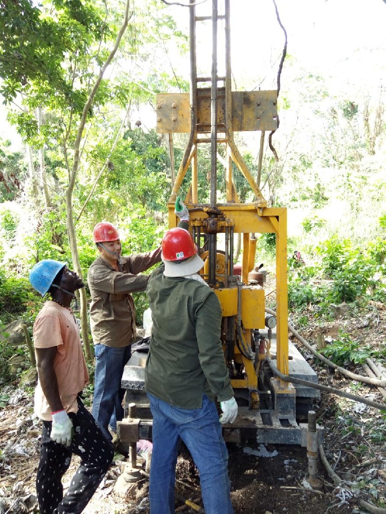 按照甲方要求 , 項(xiàng)目組成員于2017 年3月按時(shí)到達(dá)格林納達(dá),第一時(shí)間拜訪了中國(guó)駐格林納達(dá)大使館大使及管理該項(xiàng)目的當(dāng)?shù)卣畽C(jī)構(gòu),詳細(xì)了解了施工地區(qū)安全形勢(shì)及施工期間需要注意的事項(xiàng)。由于前期各項(xiàng)工作準(zhǔn)備充足,項(xiàng)目組人員到達(dá)場(chǎng)地后很快進(jìn)入了工作狀態(tài),馬上對(duì)各個(gè)場(chǎng)地進(jìn)行現(xiàn)場(chǎng)踏勘,并結(jié)合前期地形測(cè)量期間的現(xiàn)場(chǎng)實(shí)地考察,做好了施工流程安排。該項(xiàng)目共有5個(gè)場(chǎng)地,分散在不同的地區(qū)和島嶼上,相距較遠(yuǎn),施工設(shè)備搬運(yùn)比較困難,每次都要費(fèi)很大周折;因?yàn)樵摰氐靥師釒?,很多?chǎng)地都是叢林,天氣異常悶熱,大伙要經(jīng)常頂著酷熱工作,衣服每天都會(huì)被汗水浸濕;由于施工地點(diǎn)都是在斜坡上,工作人員要保證施工安全的情況下還要時(shí)刻保持身體的平衡,給施工增加了難度。面對(duì)重重挑戰(zhàn),項(xiàng)目組成員團(tuán)結(jié)協(xié)力,迎難而上,克服氣候、環(huán)境惡劣、語(yǔ)言交流不暢等困難,最終順利完成了五塊場(chǎng)地的勘察工作,共完成地形圖測(cè)量0.785km,勘察孔198個(gè),合計(jì)完成鉆探2149延米。